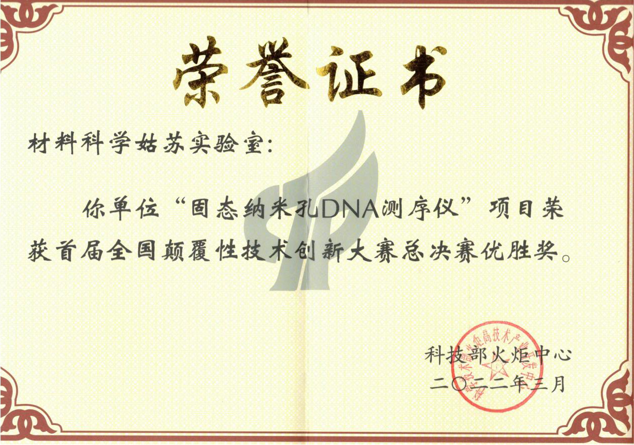 近期,由国家科技部主办的首届全国颠覆性技术创新大赛落下帷幕,材料科学姑苏实验室G2112胡岚团队的“固态纳米孔DNA测序仪”项目,从全国2724个项目中脱颖而出,经过领域赛、总决赛层层选拔,荣获大赛最高奖项——总决赛优胜奖(36个)。
