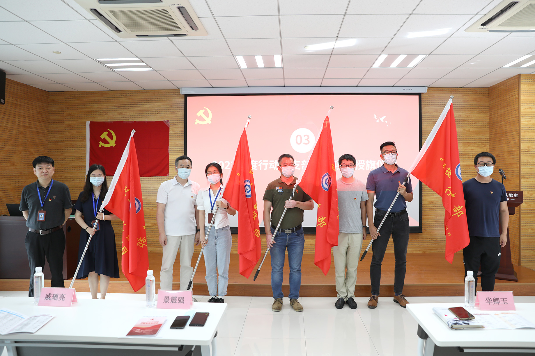 随后,举行了2022年度行动党支部行动项目授旗仪式,4位党支部书记代表支部全体党员庄重地从党总支委员手中接过行动旗帜。2021年,围绕实验室科研、管理和支撑工作中的难点、痛点问题,锁定攻坚克难目标,党总支组织实施了“服务科研素能提升”、“科研攻坚能力提升”和“核心竞争力的战略千里眼”三个行动项目,取得了初步成效。2022年,党总支继续深化行动党支部建设,又提炼发布了“破除“卡顿点”,提高流畅度”、“创新集群建设探索先锋”、“能力机体建设”和“科技创新,先锋赋能”四个行动项目,将行动支部建设进一步推向深入。