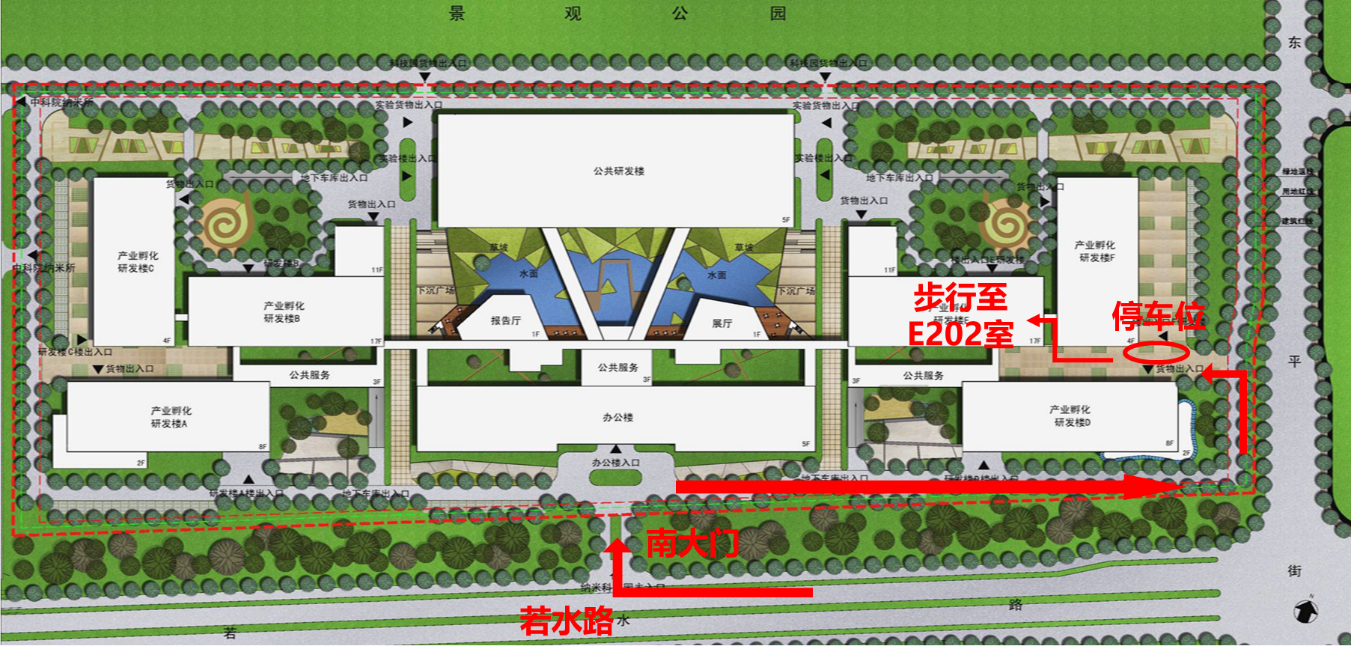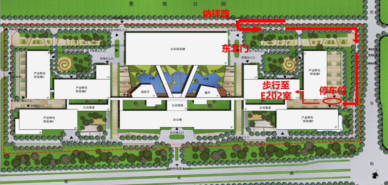 从纳祥路东北门进入,左转向东行驶到底后右转向南行驶200米即可。