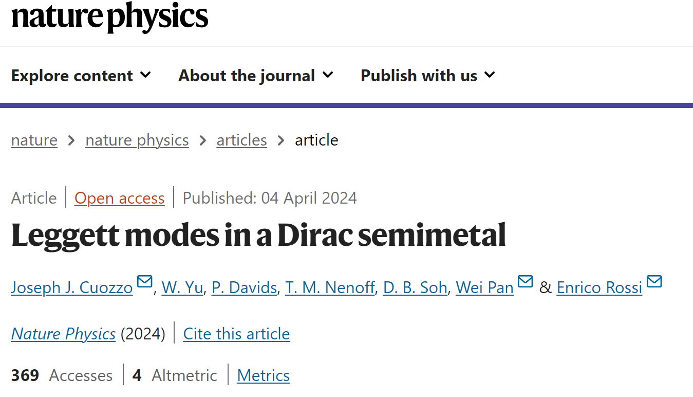 2024年4月4日,Nature Physics在线刊发了一项题为“Leggett modes in a Dirac semimetal”的重磅科研成果——在狄拉克半金属中发现了Leggett模式的存在。这一突破性发现为进一步理解量子材料的特殊性质打开了新的大门,为量子物理和凝聚态物理领域的研究带来了新的突破,对开发基于量子材料的新型电子器件具有重要意义。该研究工作由来自姑苏实验室的于文龙博士作为共同第一作者完成。于文龙现任姑苏实验室系统集成调试工程化平台负责人,致力于超导量子器件和芯片的研究以及超导量子计算系统的集成优化。于文龙拥有中国科技大学的应用物理学士学位和美国佐治亚理工学院的物理博士学位,曾在美国桑迪亚国家实验室和阿里巴巴达摩院从事相关研究工作。他在极低温物理、新型量子材料、拓扑超导、超导量子计算等领域具有深厚的专业积累。