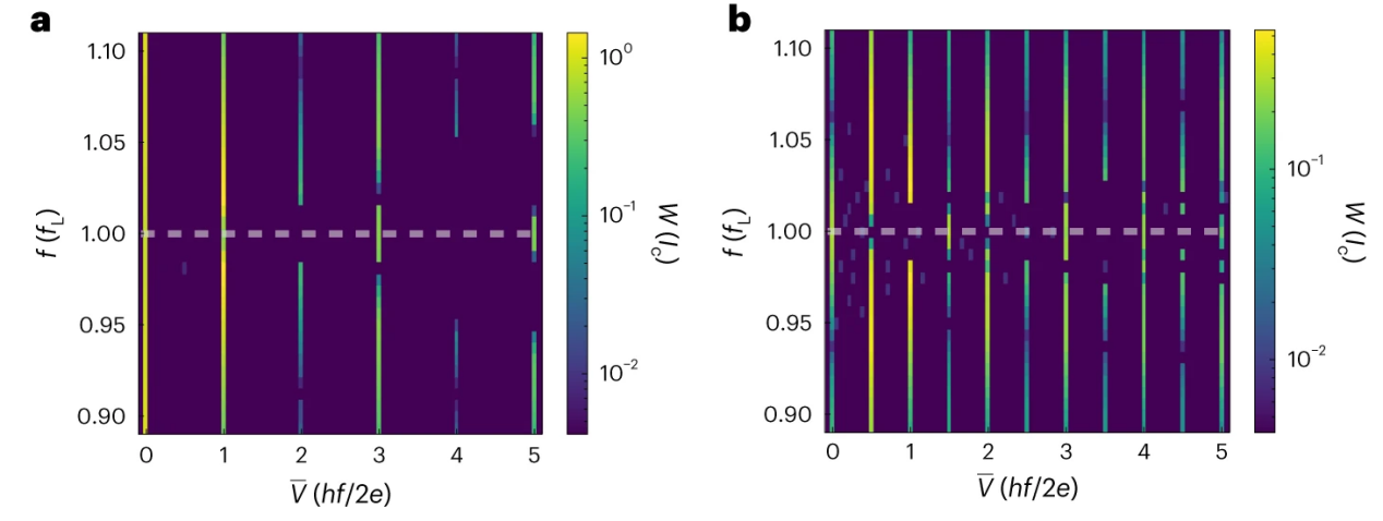 Leggett模式对SQUID的Shapiro台阶的影响水平虚线表示交流信号频率等于Leggett模式的振荡频率的位置。a.在外部磁通Φext = 0条件下。b.在外部磁通Φext ≠ 0条件下。