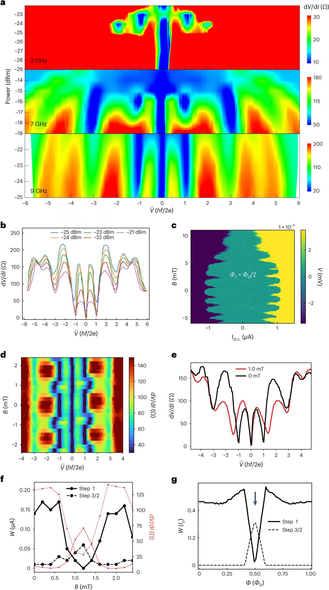 a.当磁场B = 0 时,在不同微波频率和功率下,微分电阻随Shapiro台阶的变化。b.微波频率f = 9 GHz和磁场B = 0时,在不同功率下测量的微分电阻。c.在外部磁场下,SQUID表现出异常振荡。d.微波频率f = 9 GHz,微波功率为-22dBm时,微分电阻随Shapiro台阶和磁场的变化。e.不同磁场下的Shapiro台阶。f.Shapiro台阶宽度和差分电阻随磁场变化。g.理论计算的Shapiro台阶宽度随磁通变化。
