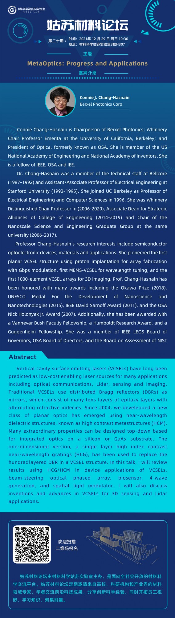 活动预告|姑苏材料论坛(第二十期)——Connie J. Chang-Hasnain院士