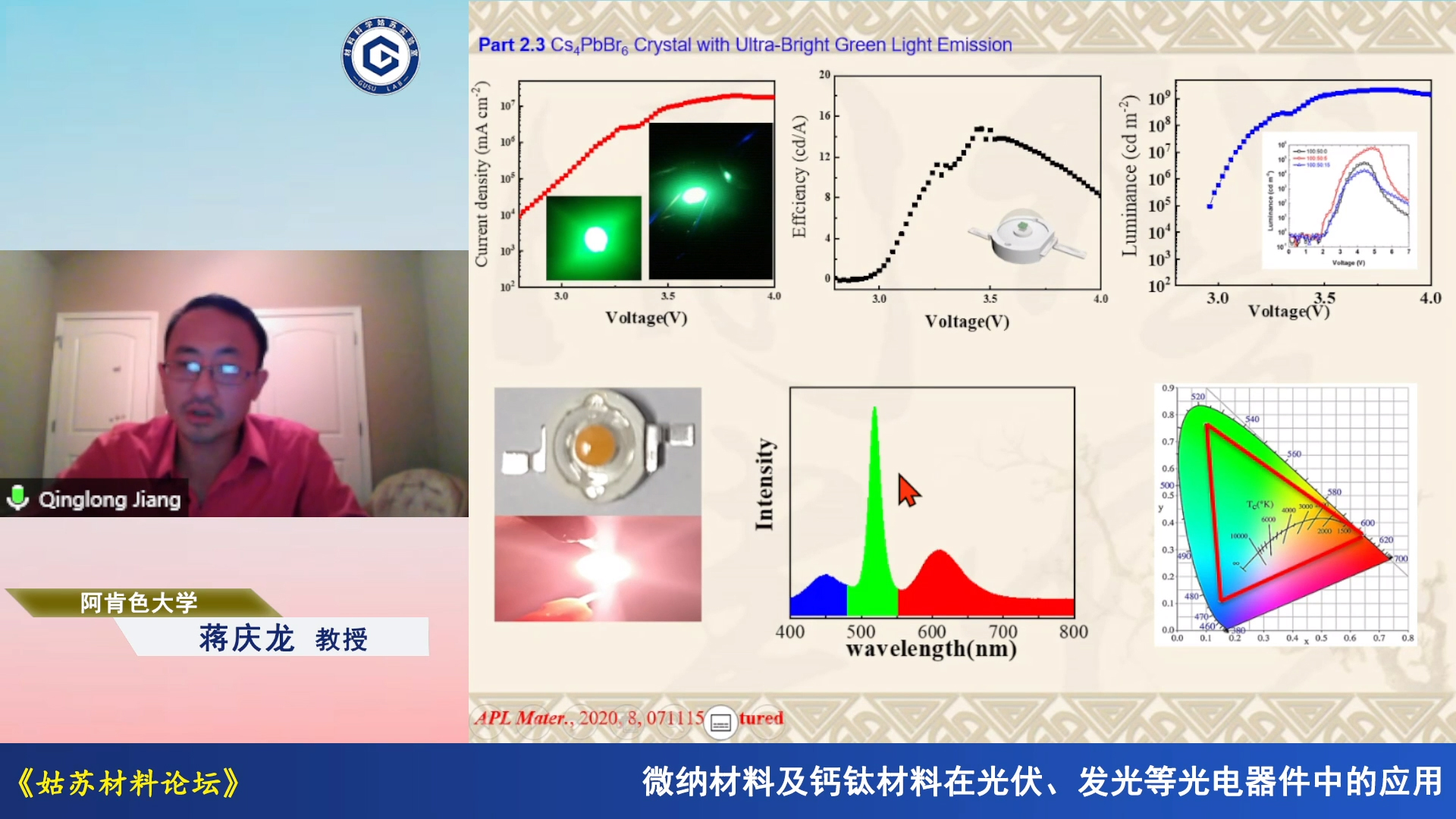 4月19日上午,美国阿肯色大学副教授蒋庆龙博士应邀做客第28期姑苏材料论坛,作《Hybrid halide perovskites materials and nano materials for solar cells, light emitting and other electric-optical devices(钙钛材料及微纳材料在光伏、发光等光电器件中的应用)》线上学术报告。